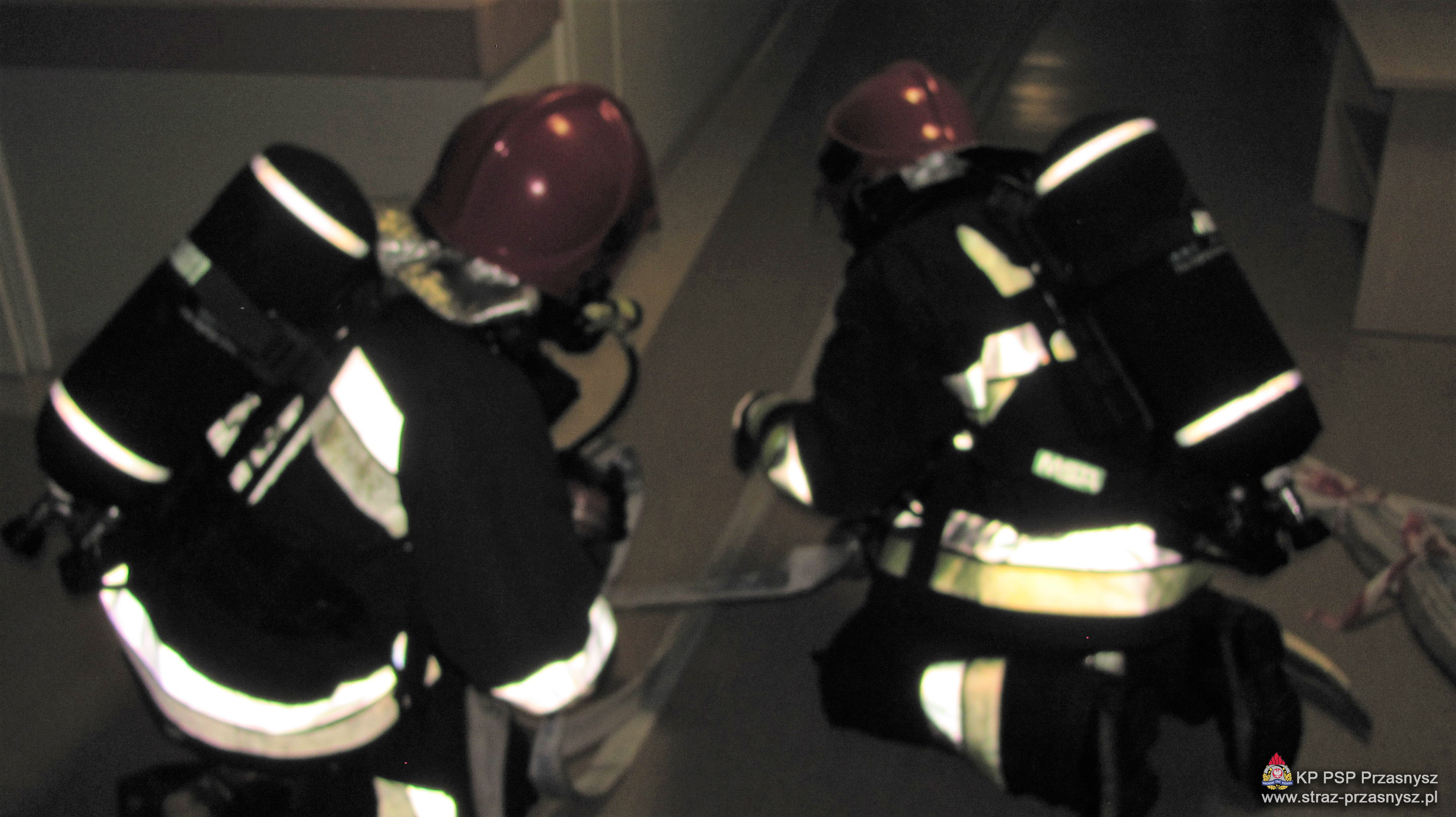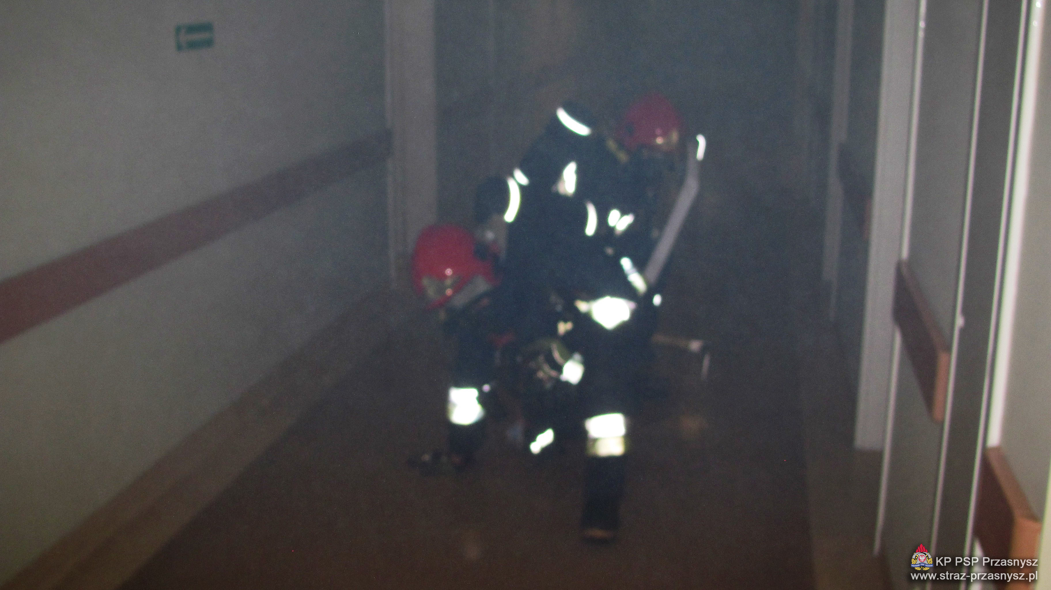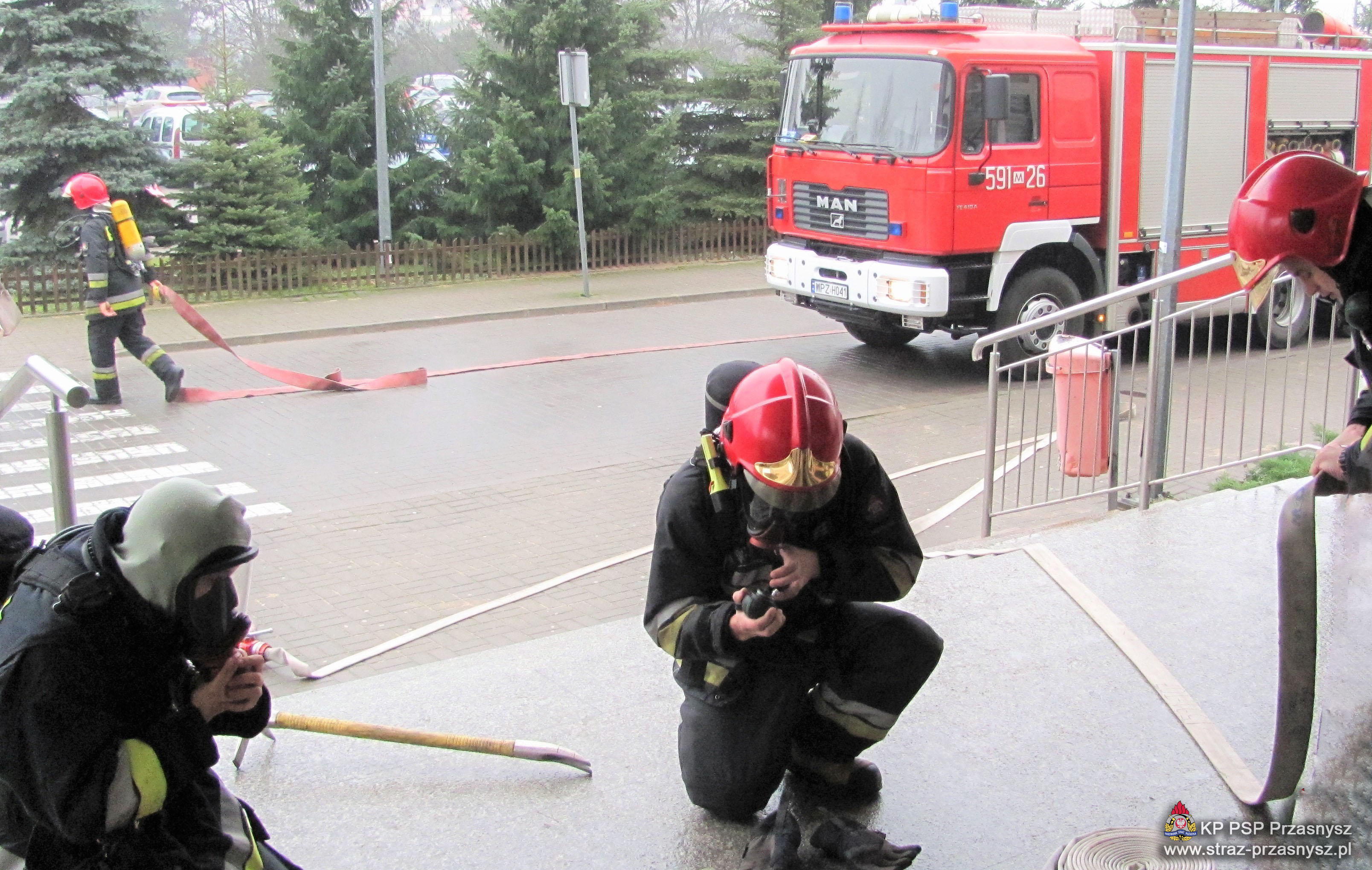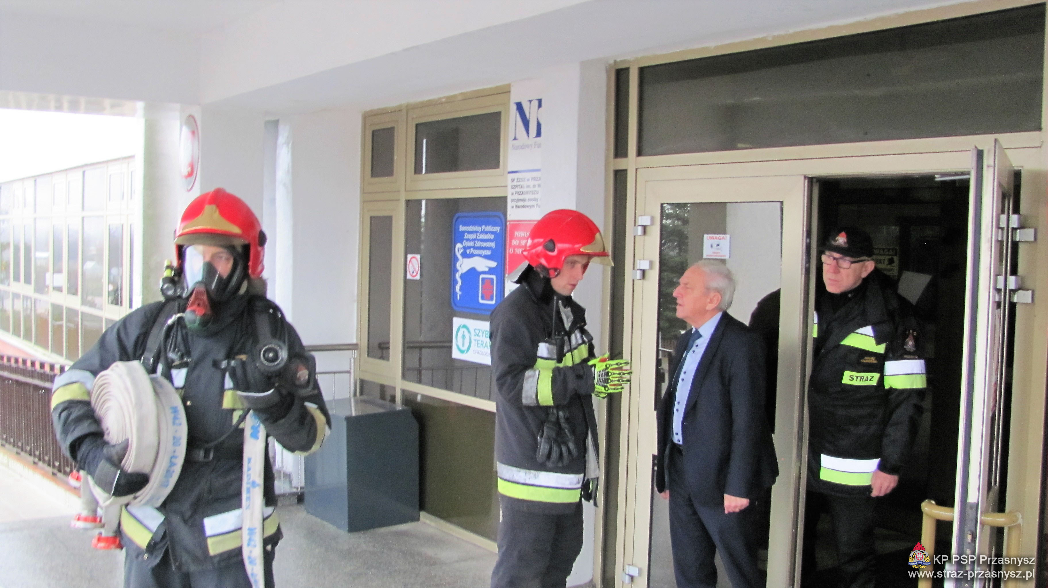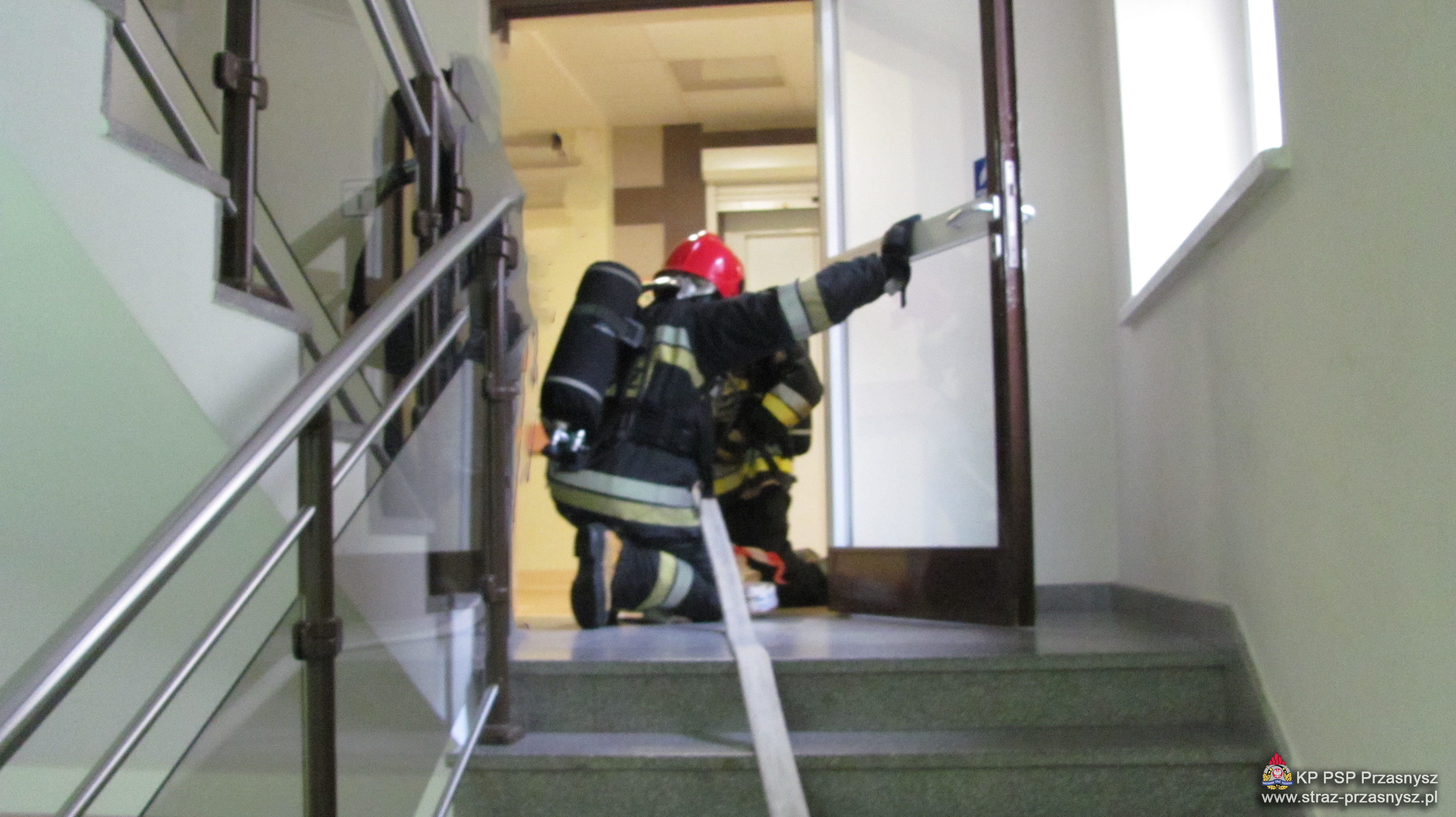 Strażacy przystąpili do akcji gaśniczej i przeszukali zadymione piętro w celu wykluczenia obecności osób poszkodowanych. W zadymionej strefie nie było już żadnych osób. Do symulowanego pożaru doszło na pierwszym piętrze w pomieszczeniach administracyjno-biurowych w skutek zwarcia instalacji elektrycznej w kuchence mikrofalowej. Ogień zajął mikrofalówkę, następnie szafki i wyposażenie wnętrza.