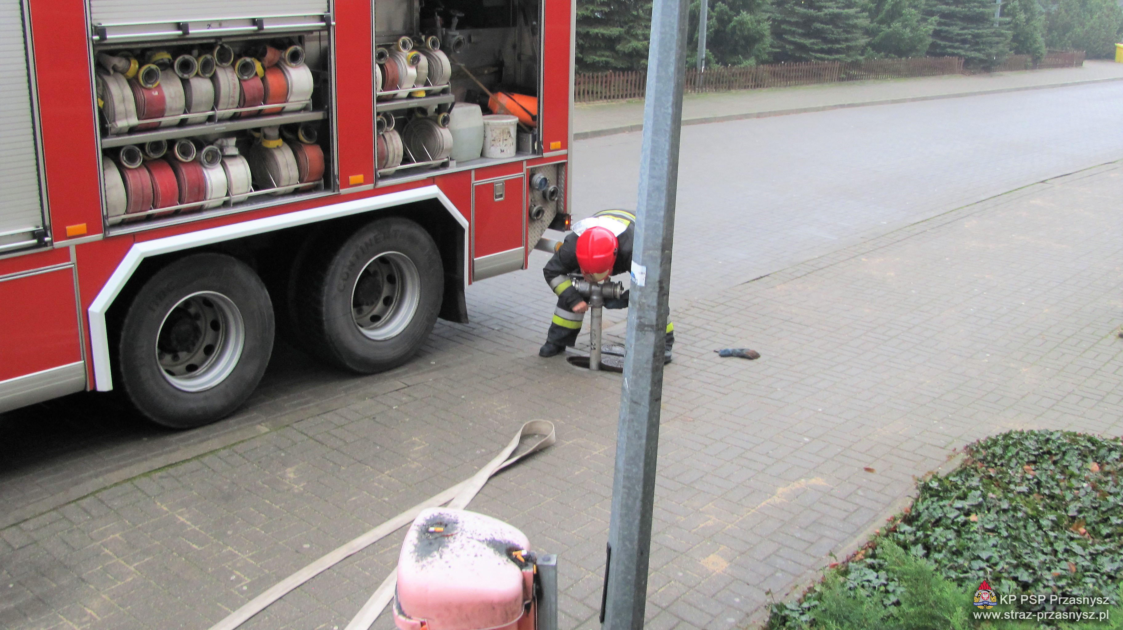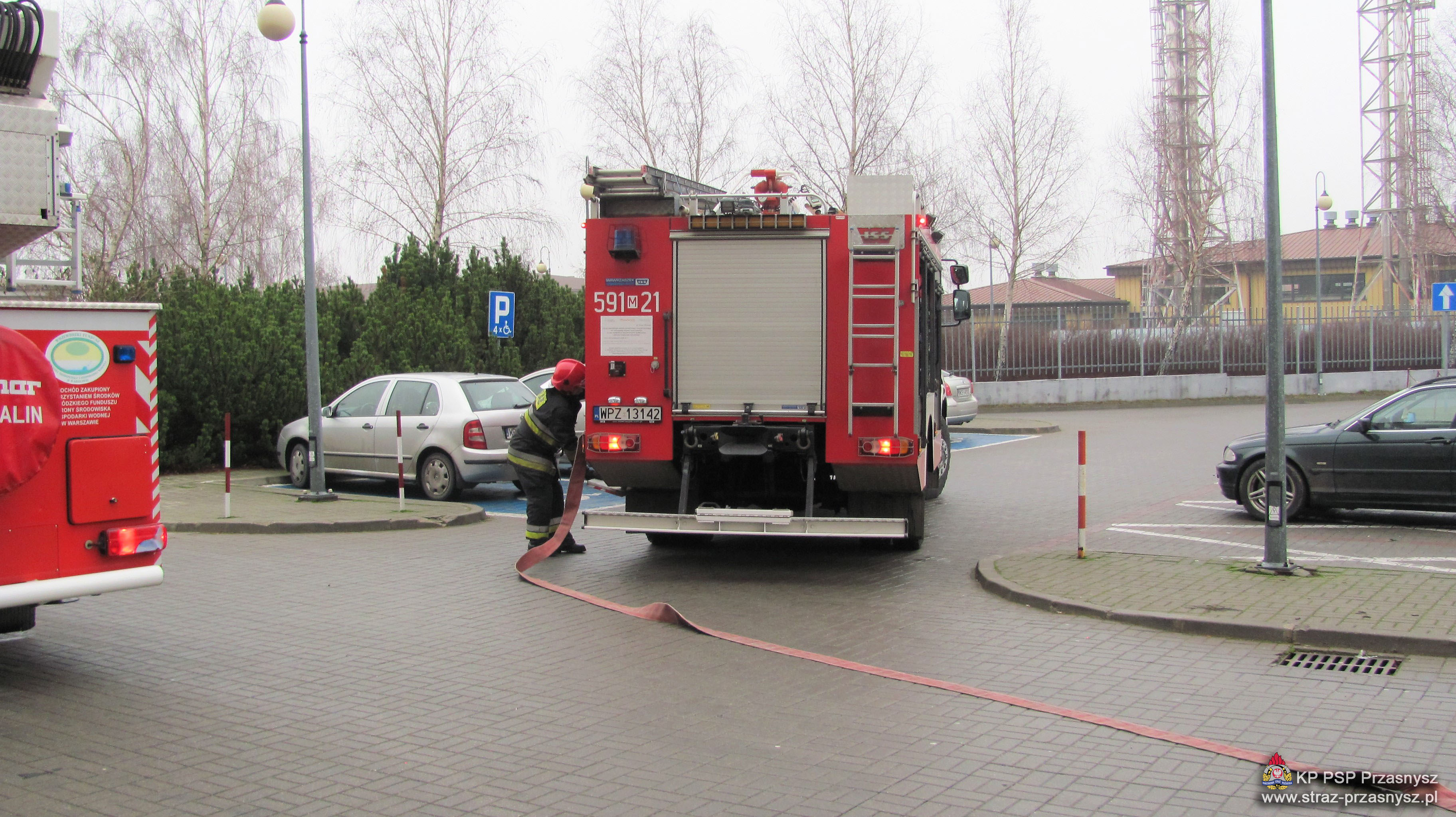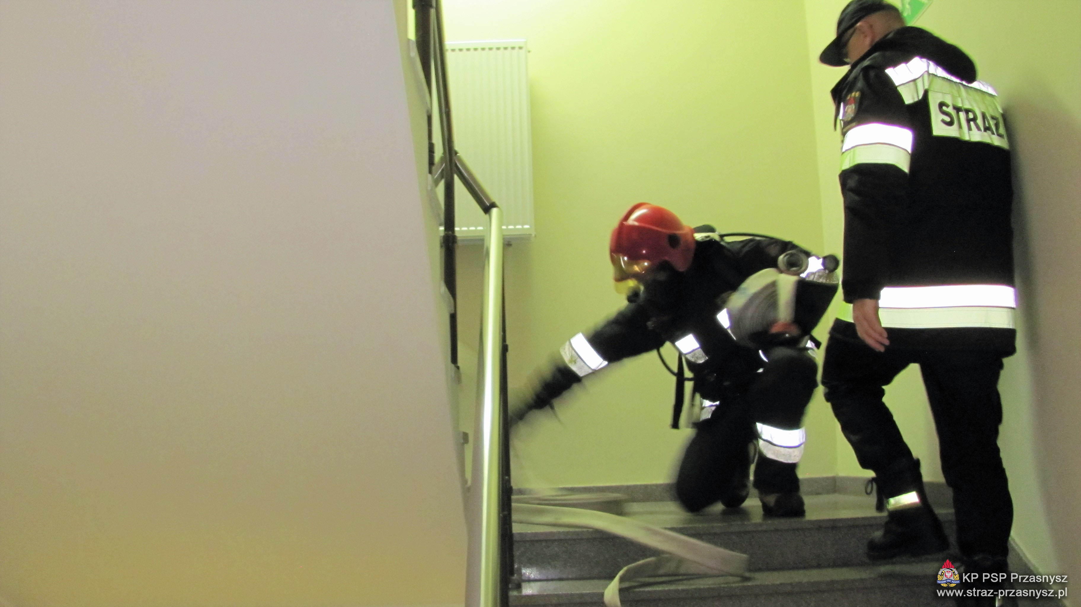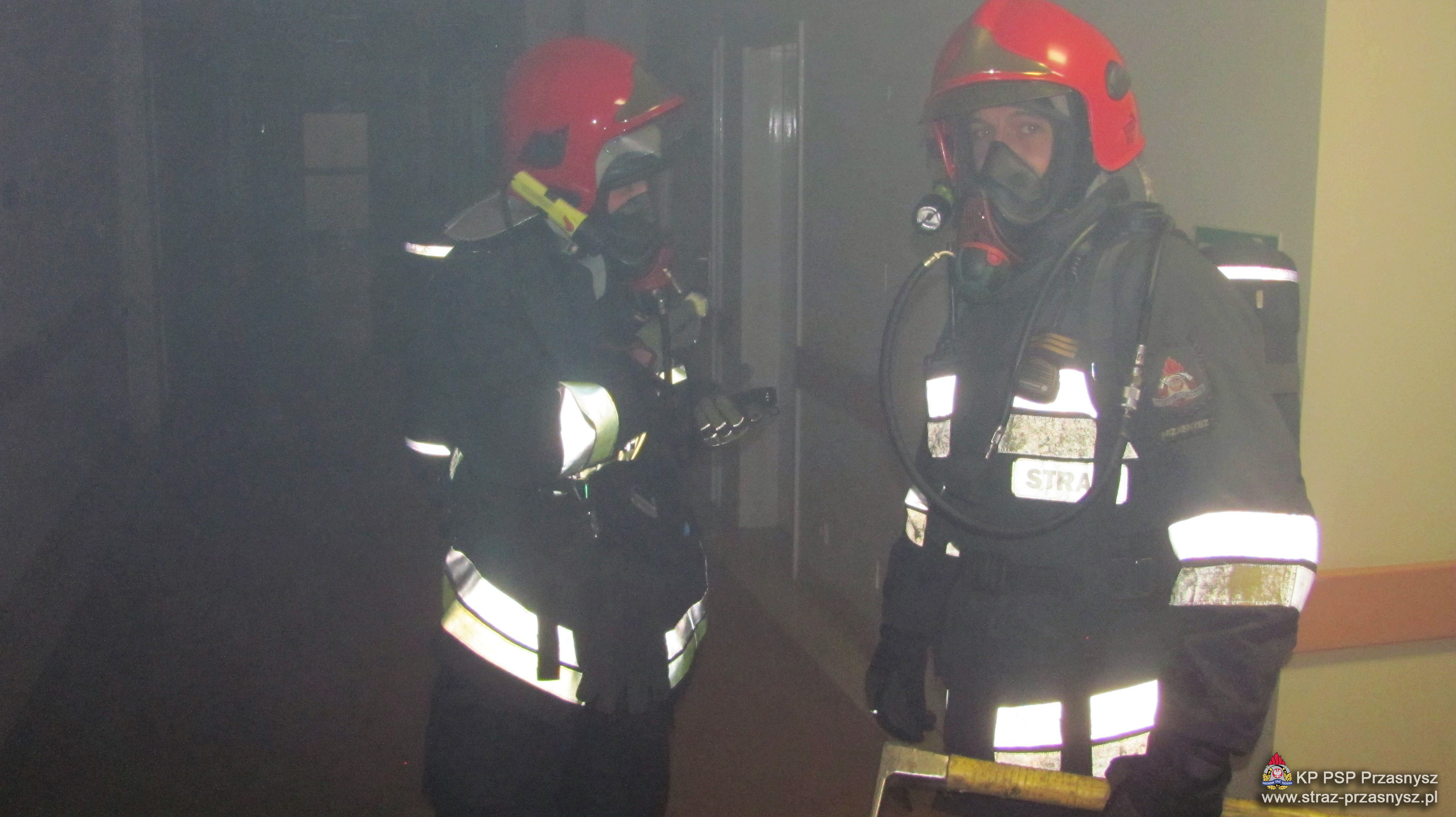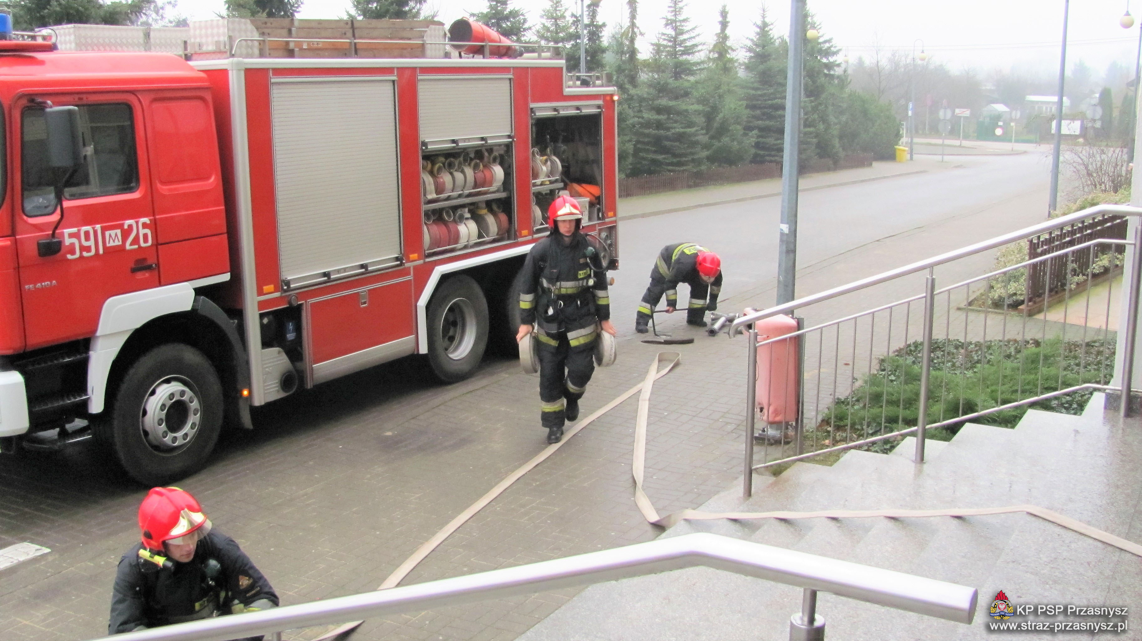 Strażacy przystąpili do akcji gaśniczej i przeszukali zadymione piętro w celu wykluczenia obecności osób poszkodowanych. W zadymionej strefie nie było już żadnych osób. Do symulowanego pożaru doszło na pierwszym piętrze w pomieszczeniach administracyjno-biurowych w skutek zwarcia instalacji elektrycznej w kuchence mikrofalowej. Ogień zajął mikrofalówkę, następnie szafki i wyposażenie wnętrza.