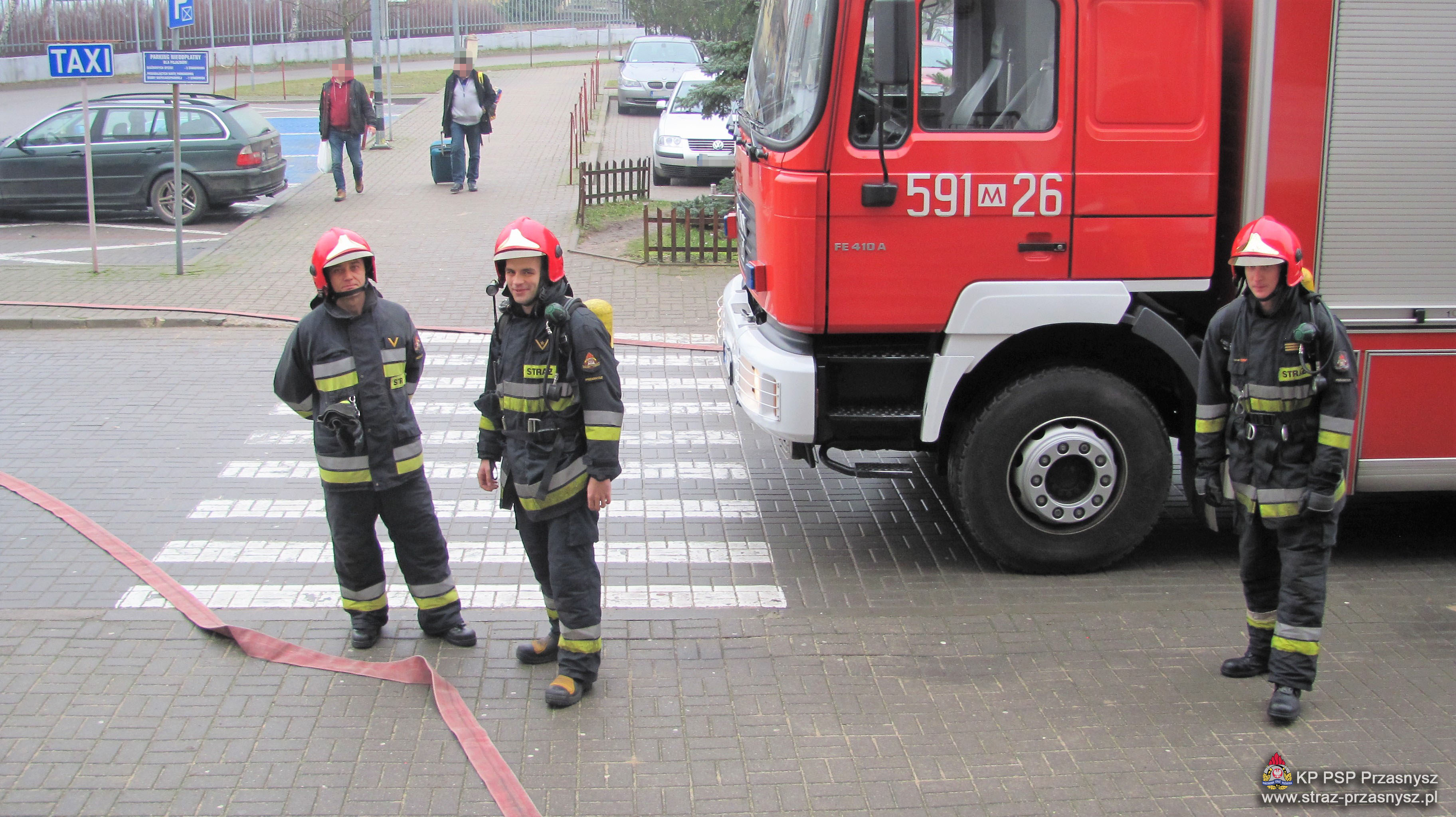 Strażacy przystąpili do akcji gaśniczej i przeszukali zadymione piętro w celu wykluczenia obecności osób poszkodowanych. W zadymionej strefie nie było już żadnych osób. Do symulowanego pożaru doszło na pierwszym piętrze w pomieszczeniach administracyjno-biurowych w skutek zwarcia instalacji elektrycznej w kuchence mikrofalowej. Ogień zajął mikrofalówkę, następnie szafki i wyposażenie wnętrza.