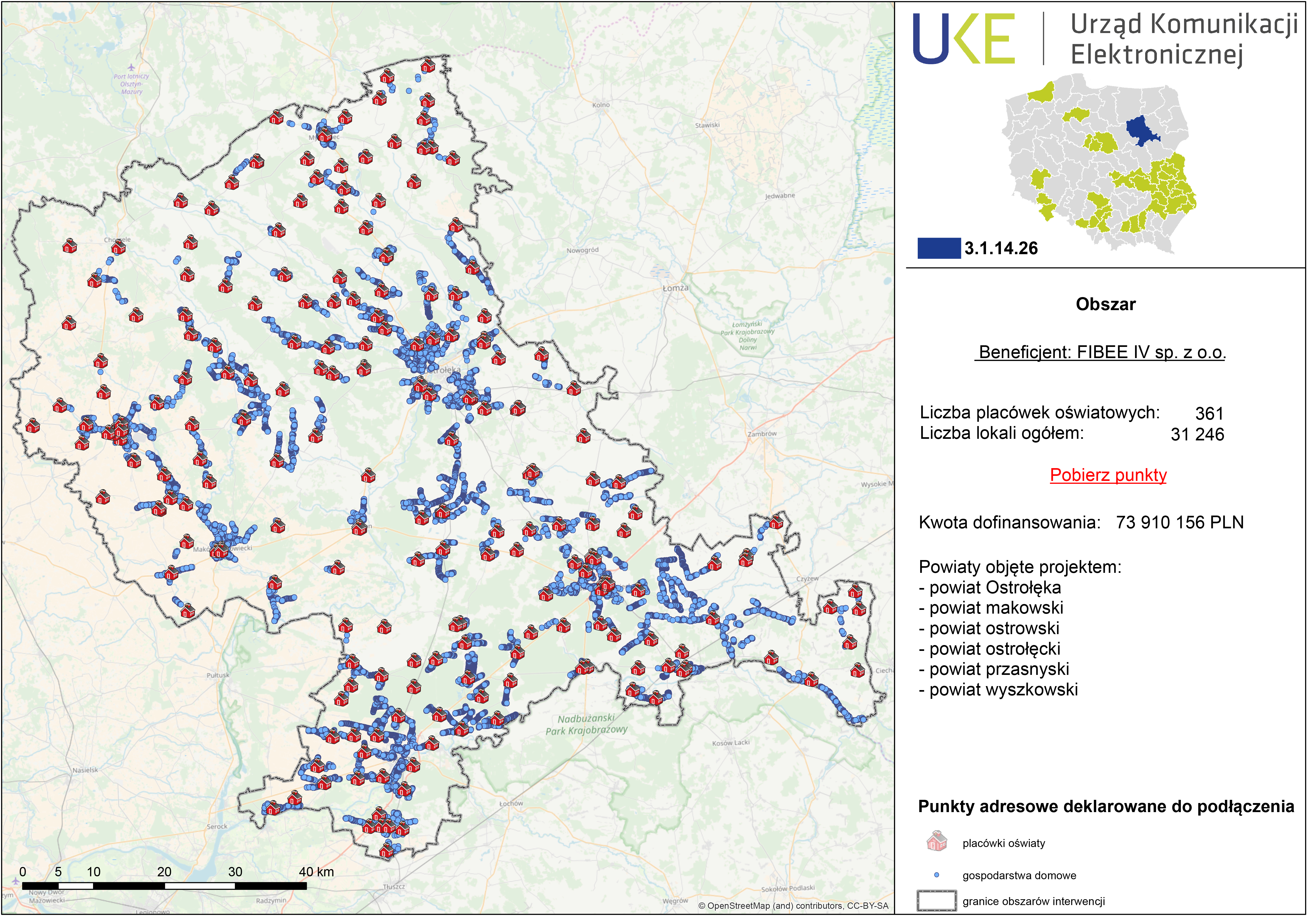 Należące do Grupy INEA spółki FIBEE I i FIBEE IV wygrały konkursy na inwestycje w aż 19 obszarach konkursowych na terenie całej Polski, w tym m.in. w powiatach: przasnyskim, ostrołęckim, makowskim, ostrowskim i wyszkowskim. Szczegółowa mapa obszaru objętego projektem budowy sieci światłowodowej dostępna jest na stronie Centrum Projektów Polska Cyfrowa: https://cppc.gov.pl/wp-content/uploads/Obszar_3_1_14_26.pdf